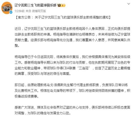 原标题:辽篮官方公告:杨鸣辞职1月26日,辽宁沈阳三生飞豹篮球俱乐部官方发布通知,确认主教练杨鸣因个人身体原因,...