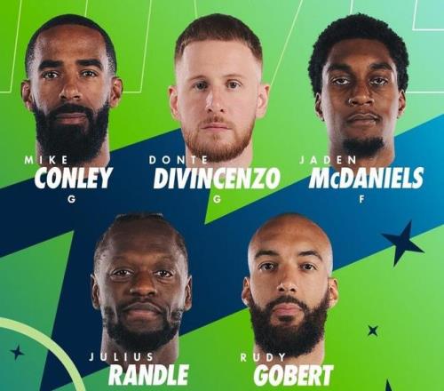 森林狼:麦克丹尼尔斯、兰德尔、戈贝尔、迪文岑佐、康利