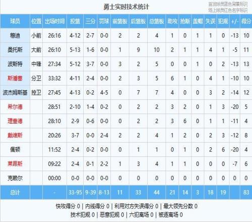 球员数据:勇士:波斯特13分5板、波杰姆斯基12分7板4助、桑托斯11分10板2助、斯潘塞10分5板6助、穆迪10分4板1助...