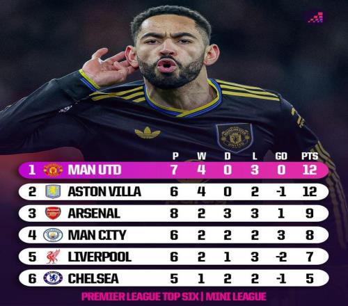 英超前六相互交锋积分榜:曼联、维拉积12分最多,阿森纳9分