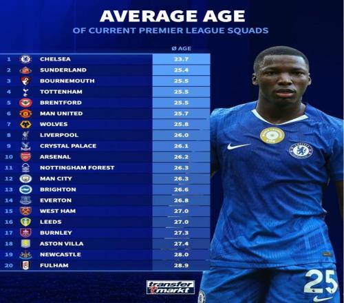 北京时间1月26日,德转统计出了本赛季英超20支球队的平局年龄,切尔西的现有阵容平均年龄仅为23.7岁,为英超最年...